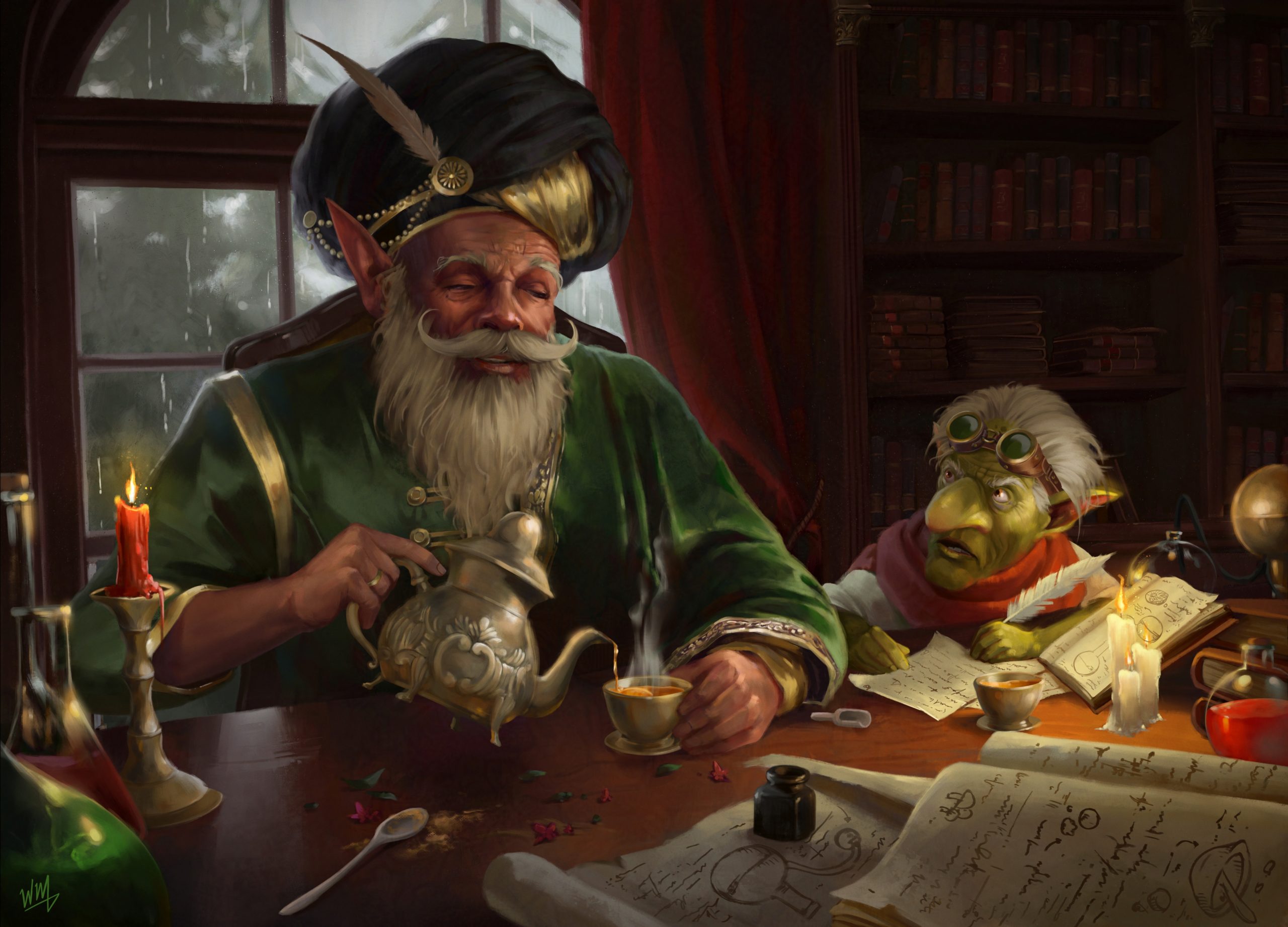 I wanted to make something more cozy, something that would warm the heart, so in the scene I depicted the master alchemist and my goblin studying on a rainy day, accompanied by a good cup of tea – the best tea Emilio, my goblin, has ever had.
